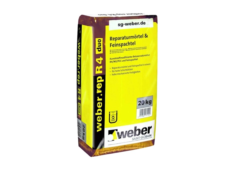 A weber.rep R4 duo felhasználható betonfelületek felújítására, zsaluzott betonfelületek kiegyenlítéséhez és simításához, betonfelületek esztétikai javításához, lejtésadó rétegként. Felújító habarcsként szintezéshez, felületi egyenetlenségek eltávolításához, lépcsőfokok javításához. Továbbá minden betonfal és padló javítási munkáihoz, valamint újraprofilozáshoz, kültéren és beltérben.