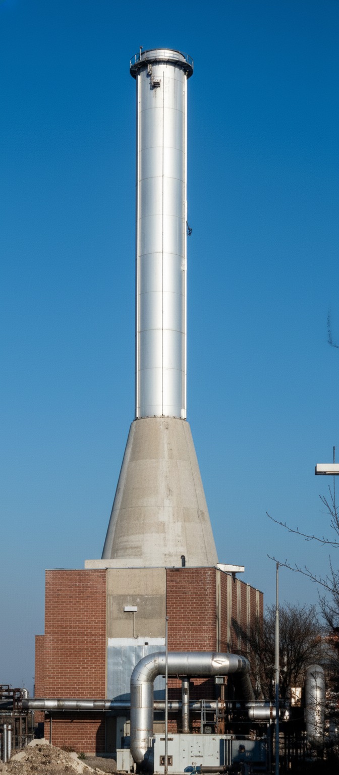 Gázturbinás erőmű. Szűk építési hely miatt a kéményt a hőhasznosítóra kellett állítani.