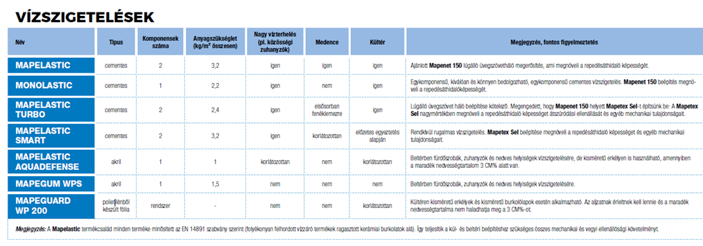 - A vízszigetelés kötőanyaga sem mindegy. Kültérben érdemes páraáteresztő termékeket választani, mint például a jól ismert kétkomponensű MAPELASTIC, vagy az egykomponensű MONOLASTIC. Beltérben, különösen gipszkarton vagy könnyűszerkezetek esetén a párazáró termékek választása a jó döntés. Ezek a könnyen felhordható egykomponensű termékek, az ún. folyékony fóliák, mint például a MAPELASTIC AQUADEFENSE vagy a MAPEGUM WPS. De ezekben a beltéri építési helyzetekben jöhetnek szóba a burkolat alatti lemezes vízszigetelések, mint például a MAPEGUARD WP 200.