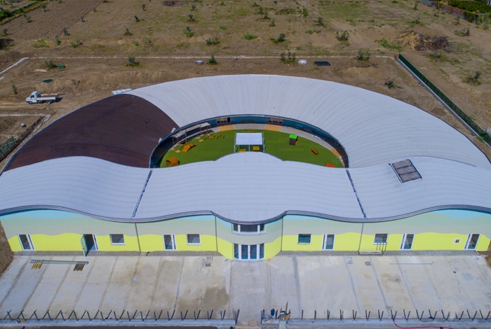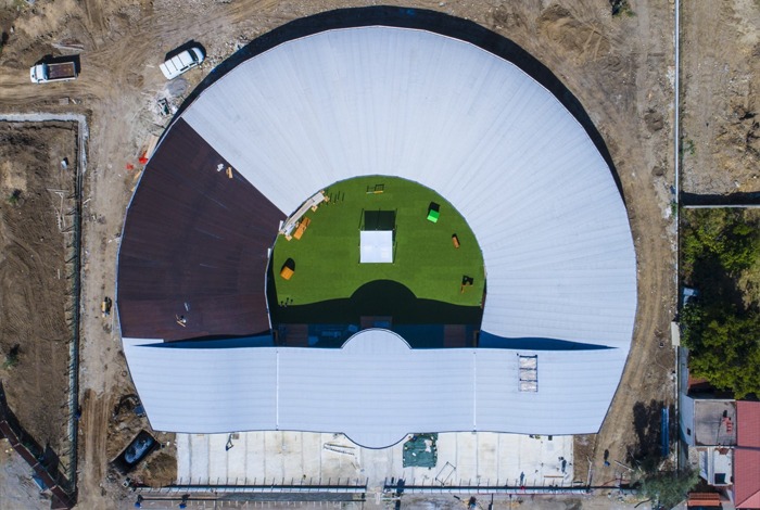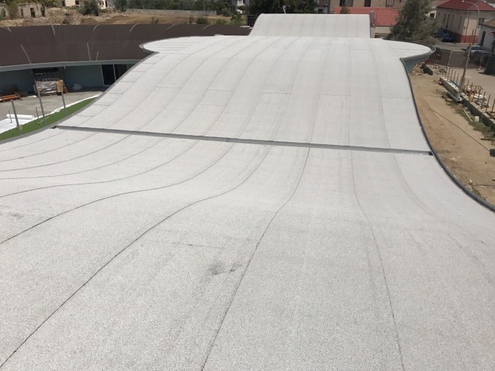 A falak teherhordó laminált faváza (REI 90-es besorolású) jellegzetes formát kapott - a képeken látható módon - félkör alakban. Az a tény, hogy az ADESO termékcsalád ELASTOFLEX SA P 2 mm-es öntapadó bitumenes lemeze nyílt láng használata nélkül is felhordható, ideális tervezési opcióvá tette a faszerkezetes tető csapadékvíz szigetelésének első rétegére. A második, fedőréteg készítésére a PLANA P GR 4.5 White Reflect lemez bizonyult tökéletes megoldásnak, amelyet lenyűgöző fényvisszaverő képessége és hőemissziós képessége miatt választottak. Ezen túlmenően a PLANA P GR 4.5 White Reflect lemez segíti az épületet abban, hogy a fényvisszaverő felület tekintetében megfelelő minősítést érjen el. A környezeti energia fenntarthatóságát az ITACA Protokoll alapján értékelték.