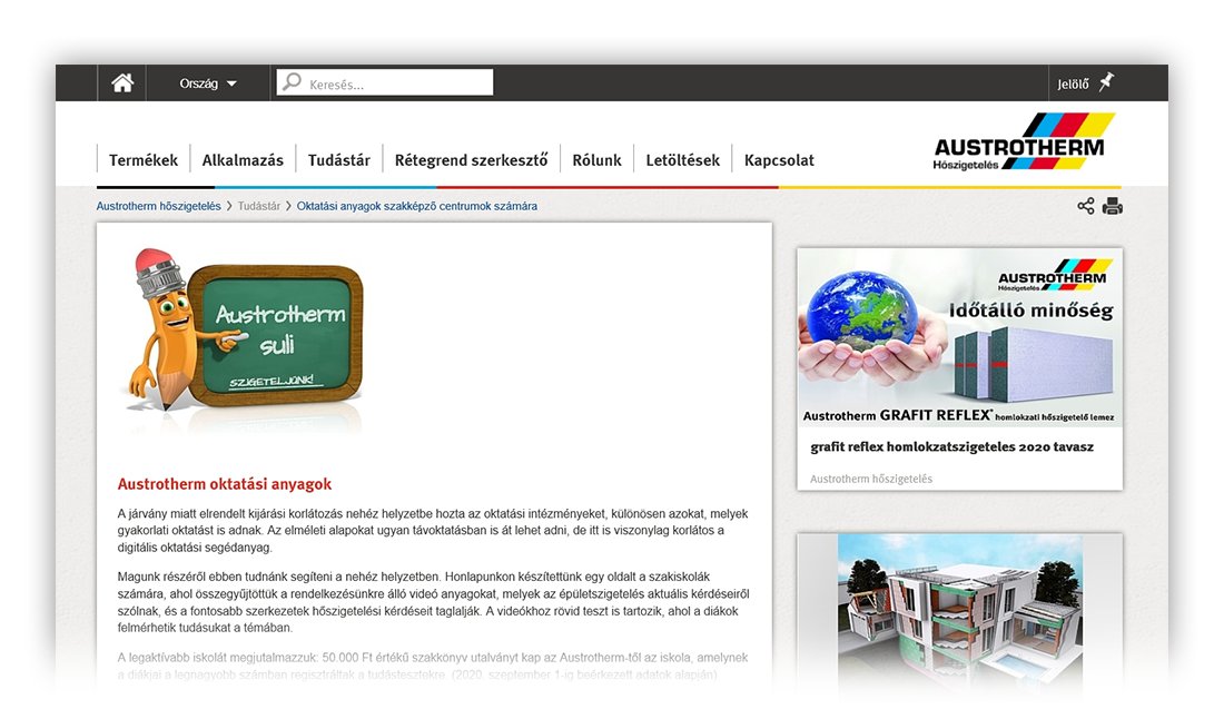 https://www.austrotherm.hu/tudastar/oktatasi-anyagok-szakkepzo-centrumok-szamara), ahol összegyűjtöttük a rendelkezésünkre álló videó anyagokat, melyek az épületszigetelés aktuális kérdéseiről szólnak, és a fontosabb szerkezetek hőszigetelési kérdéseit taglalják. A videókhoz rövid teszt is tartozik, ahol a diákok felmérhetik tudásukat a témában, így a számonkérésre is lehetőséget teremtettünk.