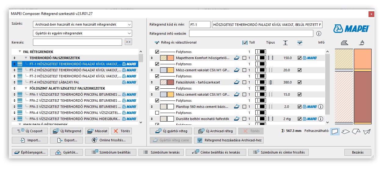 jól megszokott Archicad-es attribútumokhoz hasonlók, azok úgy vannak beleágyazva az Archicad-be, hogy az Archicad-hez szokott tervező gyakorlatilag észre sem veszi, hogy valami újdonságot használ. A rétegrendek elemei - legyenek azok akár Mapei termékek, akár más Archicad építőanyagok - nagyon könnyen cserélhetők, módosíthatók, törölhetők.