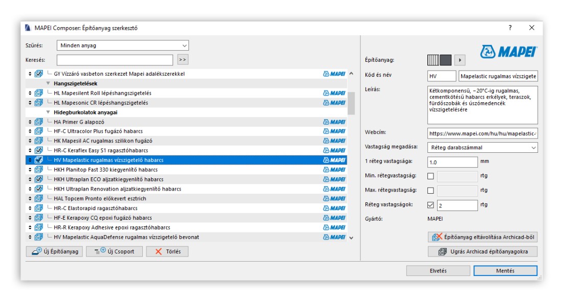 A Mapei Magyarországon a hidegburkolatoktól kezdve a vízszigetelésekig, a homlokzati hőszigetelő rendszerektől a sportburkolatokig nagyon sok terméket gyárt és forgalmaz. Ezen termékek nagy része bekerült a Composer adatbázisába. A gyártói rétegrendekből a tervező nagyon gyorsan