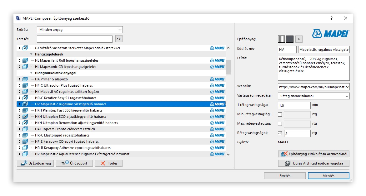 rétegvastagságot megadni. A Mapei termékekhez ezen kívül hozzárendeltünk még