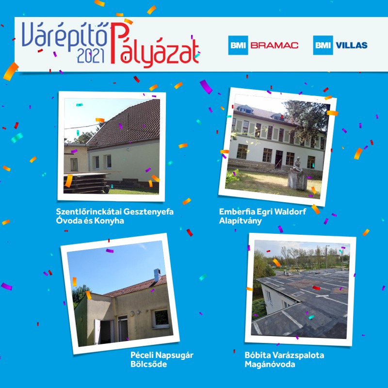 Az előző évhez hasonlóan idén is online formában zajlott a Várépítő pályázat zsűrizése és eredményhirdetése: 2021-ben rekord mennyiségű, 21 cég csatlakozott a kezdeményezéshez, köztük a sokéves hagyományt folytatva a BMI Bramac és a BMI Villas is. A két márkának köszönhetően ezúttal négy, gyermekekkel foglalkozó intézmény (két óvoda, egy bölcsőde és egy alapítvány) újulhat meg, és válhat biztonságosabbá. A két márka összesen mintegy 2 250 000 forinttal járult hozzá a felújításhoz.