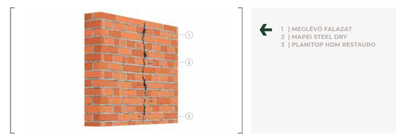 MAPEI STEEL DRY 316 rozsdamentes acél spirálrudakkal, melyek elhelyezése szárazon történik, keresztirányban és cikkcakkban elhelyezve a repedés mentén. A varrás előtt a repedés méretének függvényében injektálás is elvégezhető, mely után az alábbiak szerint kell eljárni:
