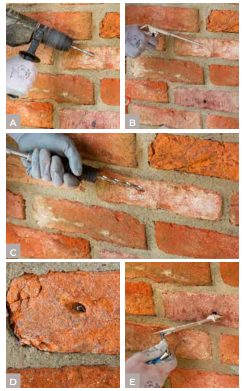 Induljon el a repedéssel érintett falazat egyik oldalától és készítsen előfuratokat, melyek átmérője kisebb, mint a beépítendő spirálrúd, míg el nem éri a másik oldalt (A kép).