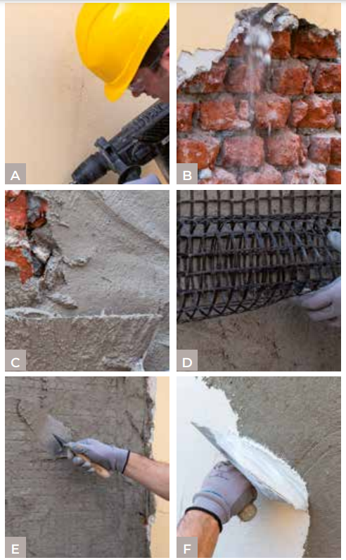 Távolítsa el a meglévő vakolatot a repedés körül kb. 60-90 cm-en (akár a függőleges falazaton, akár a boltozat alsó felületén), létrehozva a megerősítendő zónát. Ha szükséges, végezzen injektálást a konszolidáláshoz (A kép).