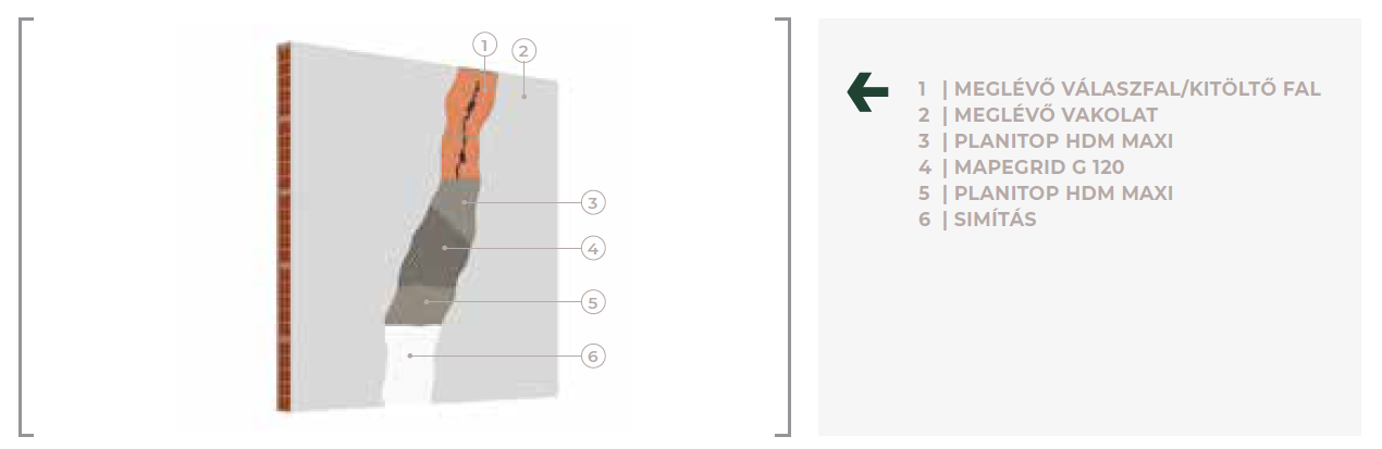 A válaszfalak és kitöltő falak helyi javítása és megerősítése elvégezhető "lokális kis vastagságú, megerősített vakolattal", az