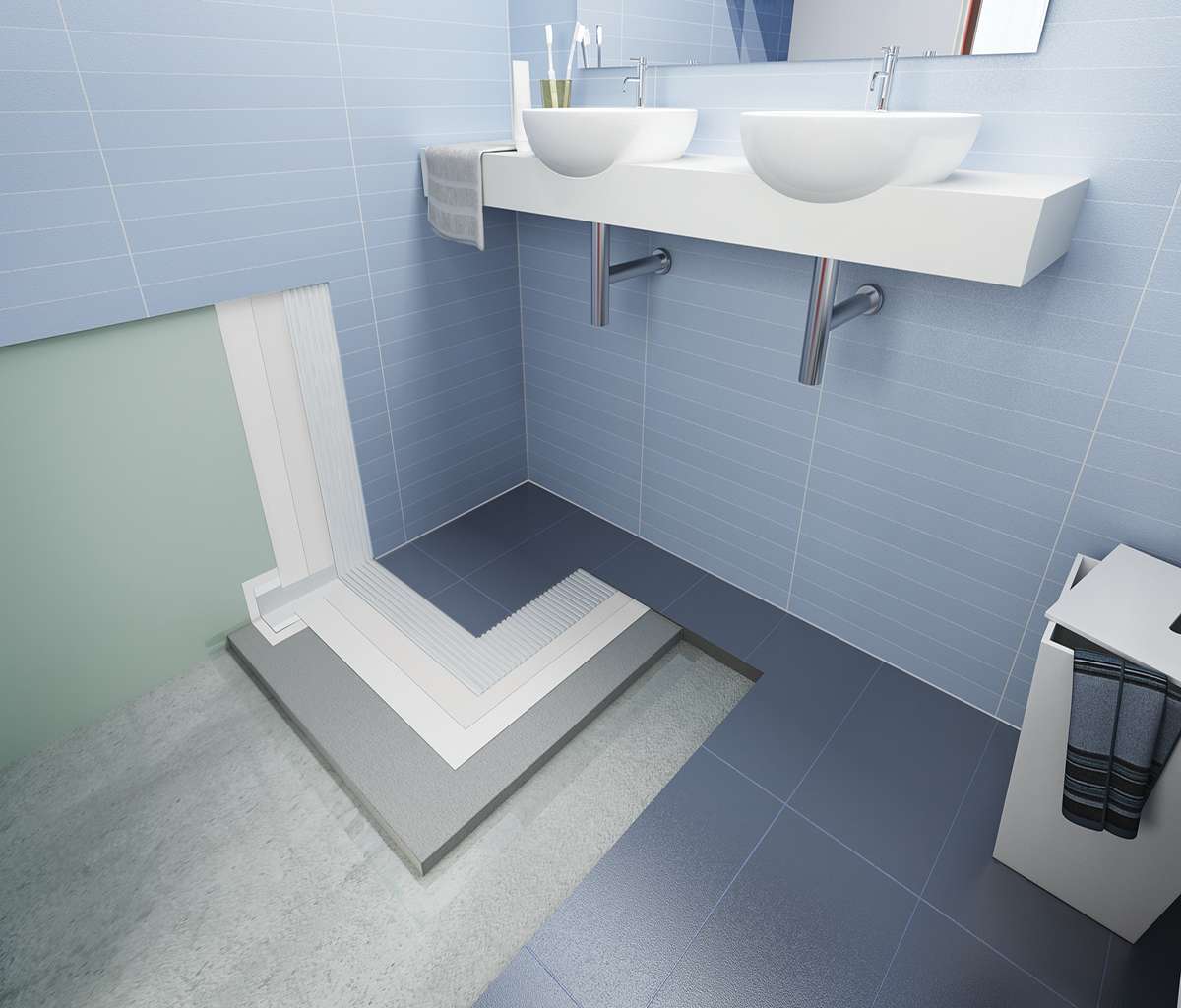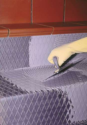 MAPELASTIC AQUADEFENSE-t vagy a MAPELASTIC WPS vízszigetelő anyagokat alapozás nélkül alkalmazzuk. A ragasztóválasztáskor 60 cm-es legnagyobb oldalhosszig javasolt fokozott terhelhetőségű (C2-es) ragasztó javasolt, mint például az