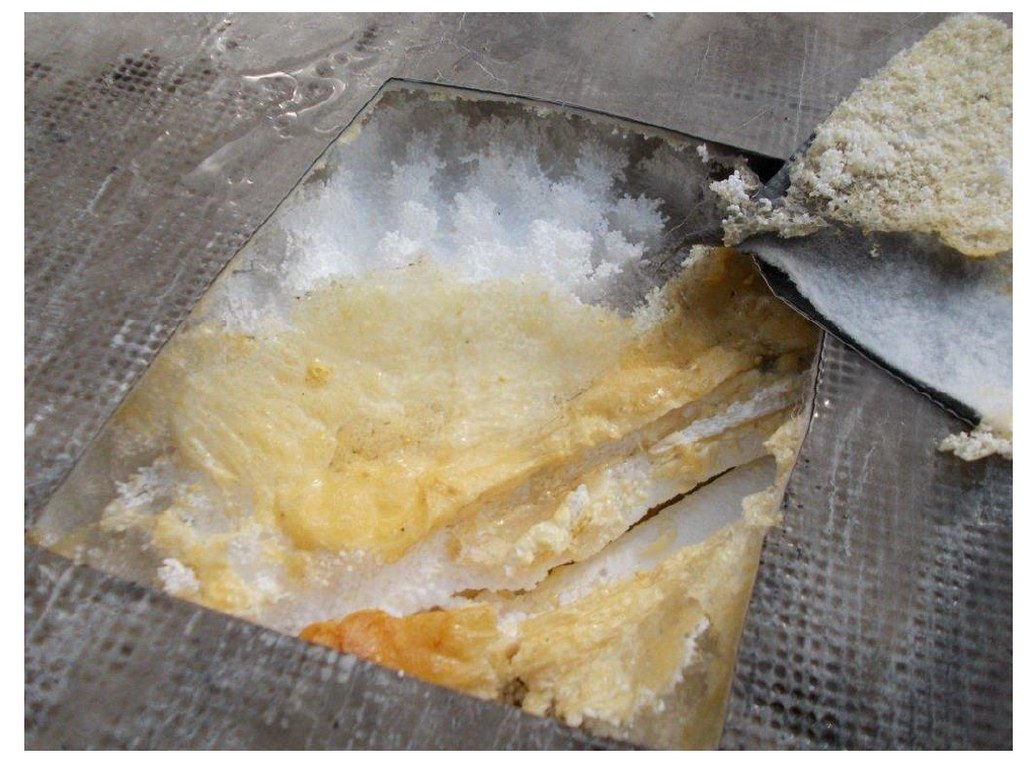 Tehát teljesen egyértelmű, hogy egy elasztomer keverékű polimer-bitumenes lemez elérhet lágyulásponthoz közeli hőmérsékletet és/vagy tükröződő felületek esetén olyan magas hőmérsékletet is, amely a termék felszíni olvadását okozhatják (Lásd 3. és 4. kép). Expandált vagy extrudált polisztirollal történt hőszigetelés esetén a hőszigetelő réteg olvadása, és ennek következtében károsodása is előfordulhat. (Lásd 5. kép)