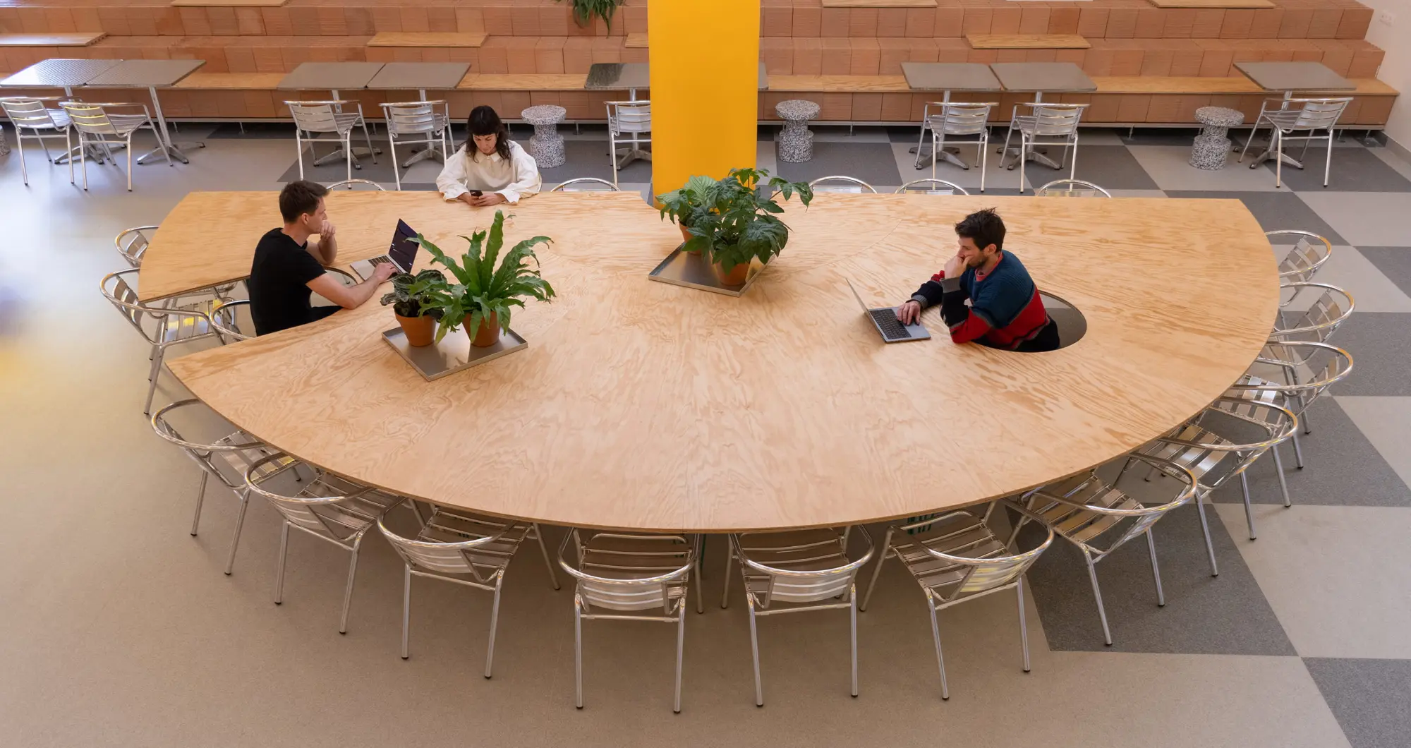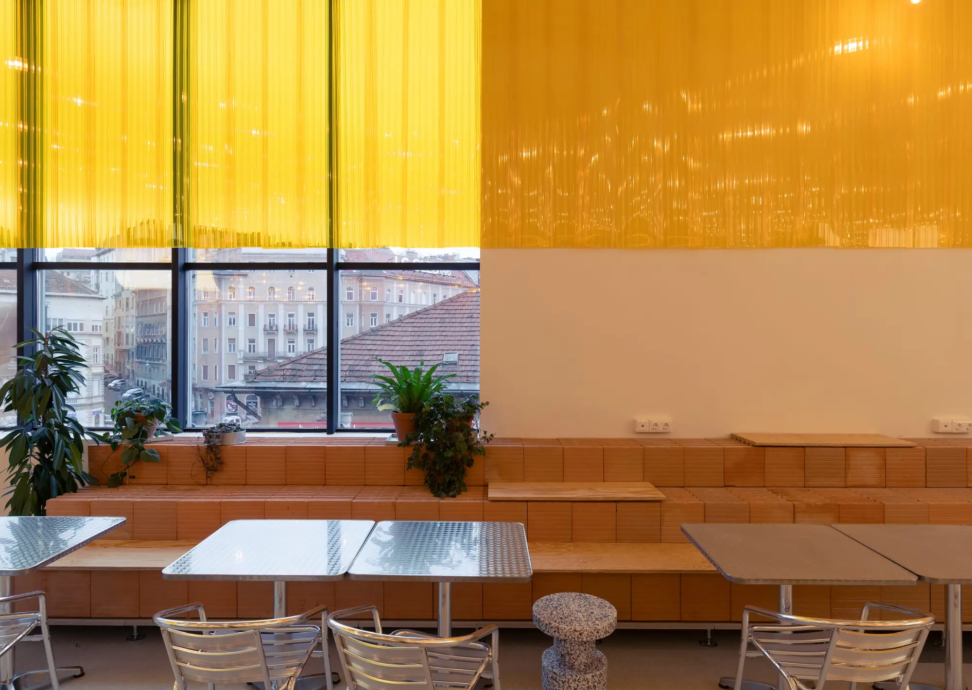 A tágas közösségi és étkezésre szolgáló helység egyik látványos eleme a 15 méteres, háromszintes, többfunkciós Porotherm téglaépítmény, amely ülőlépcsőként, padként és tárolóként is működik, és kreatívan mutatja meg, hogy a tégla jóval több, mint hagyományos falazóanyag. A téglafelületek köré szervezett további elemek - a nagyméretű közösségi asztal, a hullámzó formájú bárasztal, a hagyományos fémasztalok és karosszékek, a gyerekek számára kialakított kisebb asztalok és ülőhelyek, valamint a nagy, hengeres világítótestek - mind ehhez a természetes anyagkoncepcióhoz igazodnak.