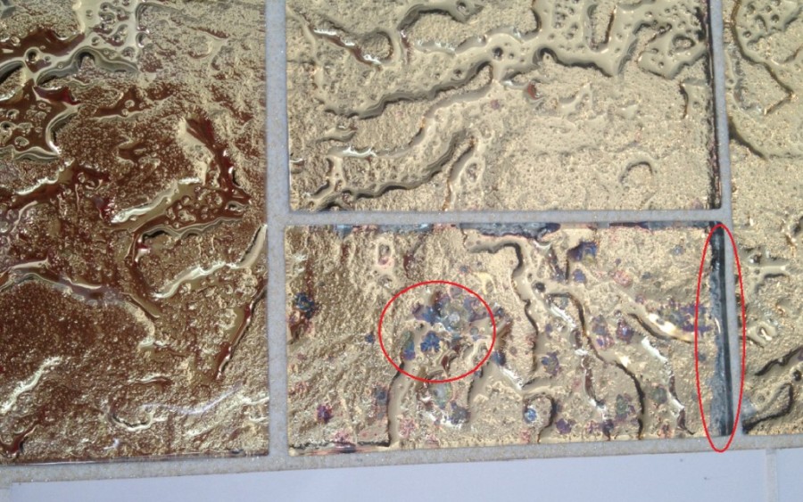 Kőmozaikoknál előfordulhat, hogy a ragasztó hatására a kövek elszíneződnek vagy a ragasztó rossz irányba módosítja a szemek árnyalatát. Érdemes a kőmozaik gyártójának ragasztó ajánlását betartani, vagy ennek hiányában próbaragasztást végezni. Ha a próbaragasztás során színproblémát tapasztalunk, akkor indokolt egy gyorskötő és kövek színéhez igazodó ragasztó használata. A szokásokkal ellentétben ez nem automatikusan egy fehér ragasztó alkalmazását jelenti, hanem azt, hogy