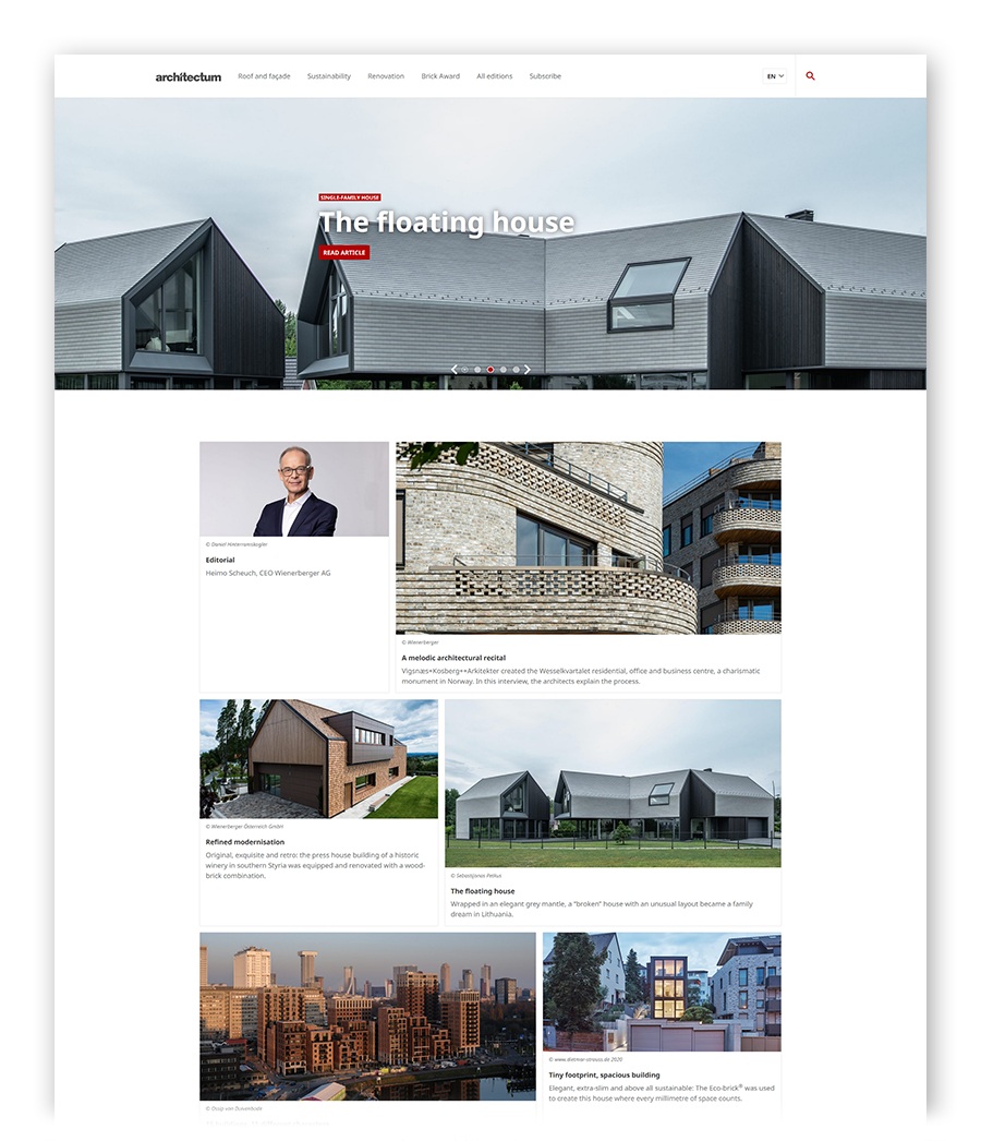 Megjelent a Wienerberger konszern által kiadott nemzetközi építészeti lapnak, az Architectumnak 2022-es tavaszi száma, mely nem csupán nyomtatott formában olvasható, hanem három nyelven - angol, német, francia - online is elérhető. A 34. lapszám témája a tető és homlokzat. A folyóiratban különleges építészeti megoldásokat mutatnak be, ahol a funkcionalitás mellett nagy hangsúlyt kapnak a kreatív felhasználási módszerek is, mellyel egyedi megjelenést kölcsönözhetünk épületeinknek.