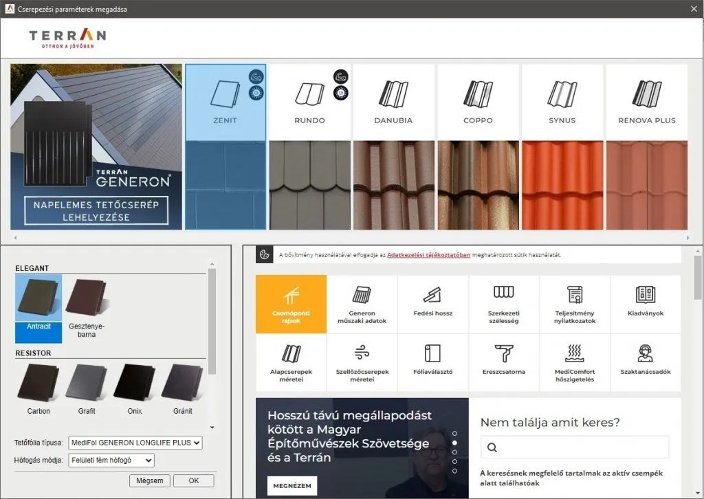 Terrán Generon napelemes tetőcserépről naprakész részletes tervezői információk érhetők el - csomópontok, alátéthéjazati információk, termékleírások, adatok, teljesítmény-nyilatkozatok -, valamint a napelemes tetőcserép a tervekbe beilleszthető (az előírásoknak megfelelő szabályokkal) és ráhelyezhető a megrajzolt tetőre, így a látványterven a Terrán Generon esztétikai előnyét is láthatja az építtető már a tervezési fázisban.