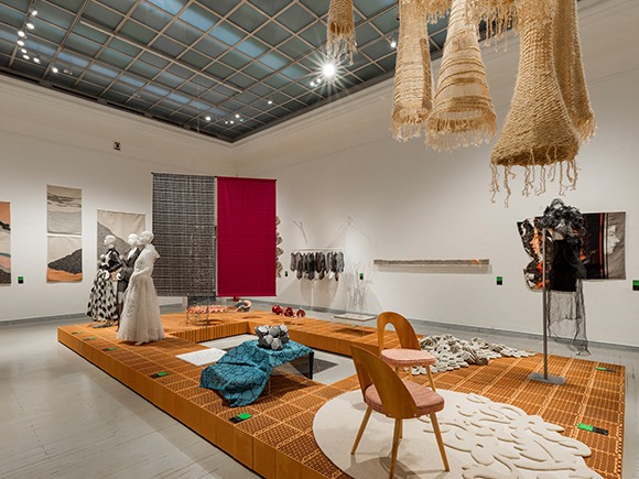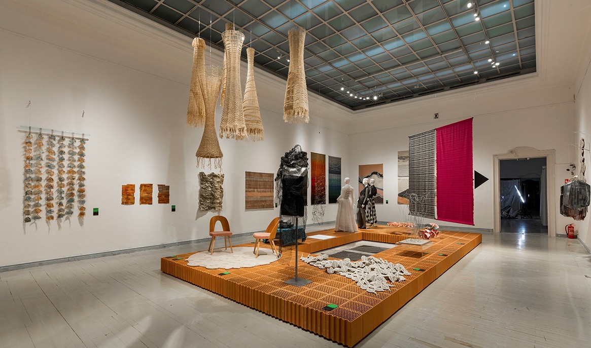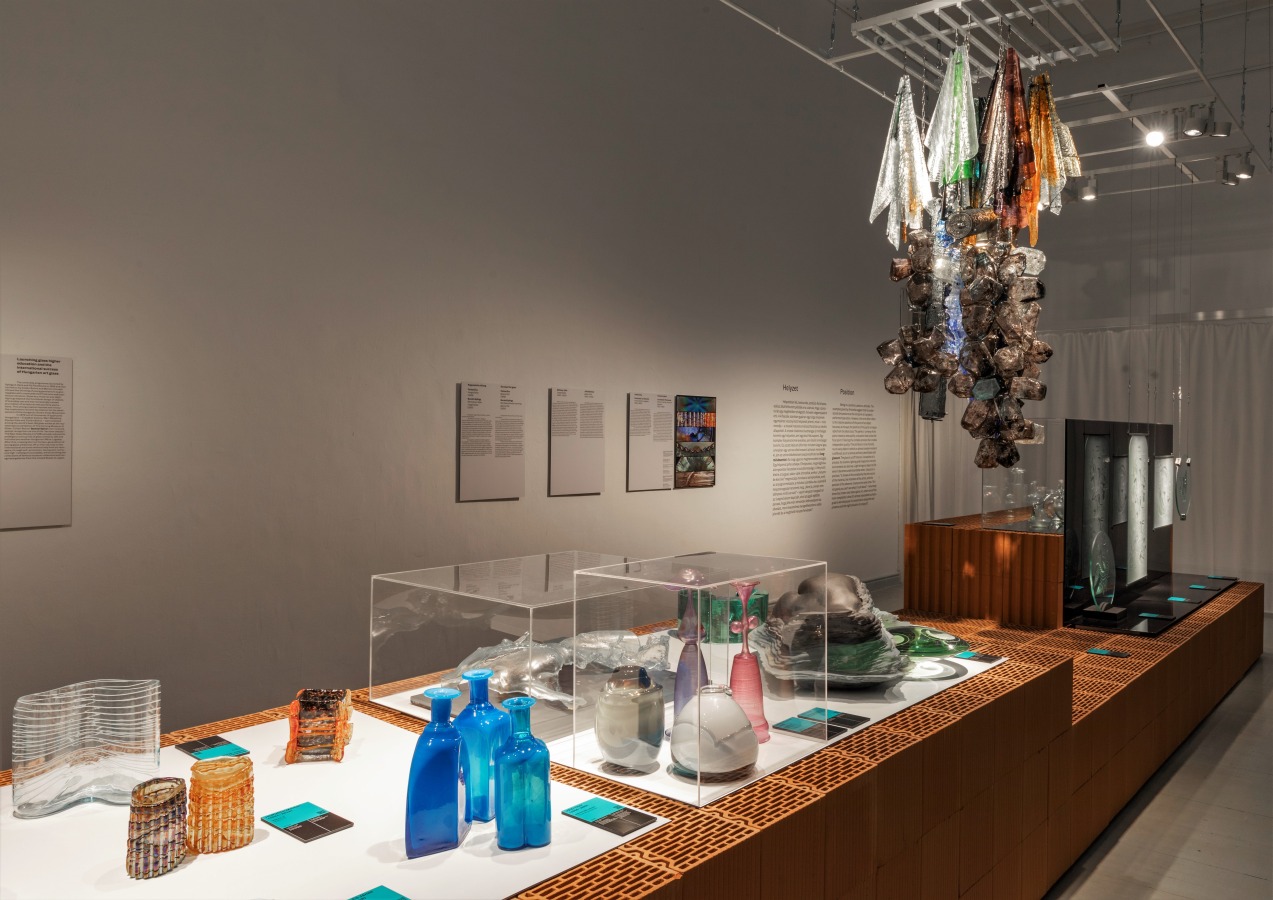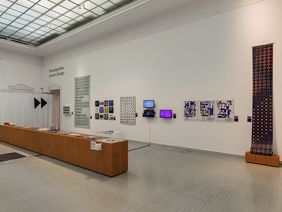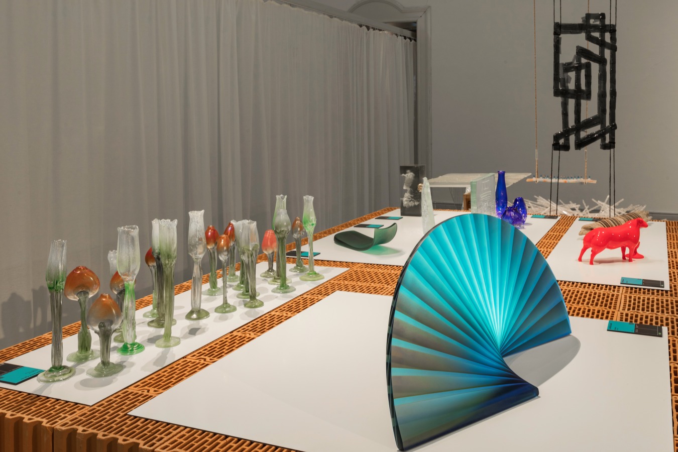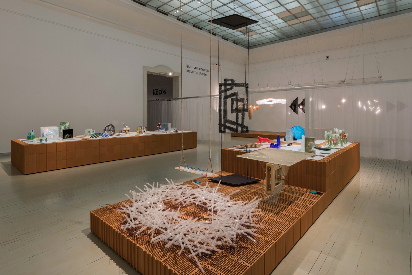 A közös tér üzenet milyen hatással volt a kiállítás építésére, tervezésére? Szabó Levente: A kiállítás installációjának megtervezésekor - kollégáimmal, Biri Balázzsal és Rátgéber Lászlóval, valamint a grafikai koncepcióért felelős Polgárdi Ákossal és Tóth Lilivel közös - célunk volt, hogy a kiállított műtárgyak egységes téri keretben legyenek kiállítva, ezzel erősítve az előbb hallott kurátori koncepciót. Abból indultunk ki, hogy a műcsarnok több mint 2000 négyzetméteres kiállítóterében jelenik meg több mint 300, méretében és léptékében különböző műtárgy. Viszont ezek mind olyan műtárgyak, amelyek valahogy a kézművességgel, iparművészettel, designnal kapcsolatosak, és szerettünk volna egy olyan installációt csinálni, ami ennek az inspiráló sokféleségnek egységes keretet tud biztosítani. Ezért döntöttünk az égetett kerámia posztamensek és a térbe belógatott, azokat osztó függönyök mellett. Így a kialakult téglaszigeteket a kiállítás terét talán újszerűen osztó függönygyűrűk szervezik közös terekbe.
