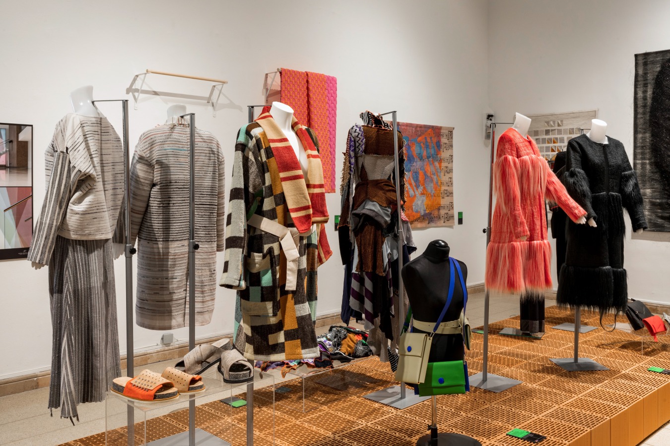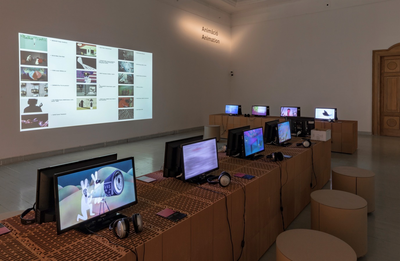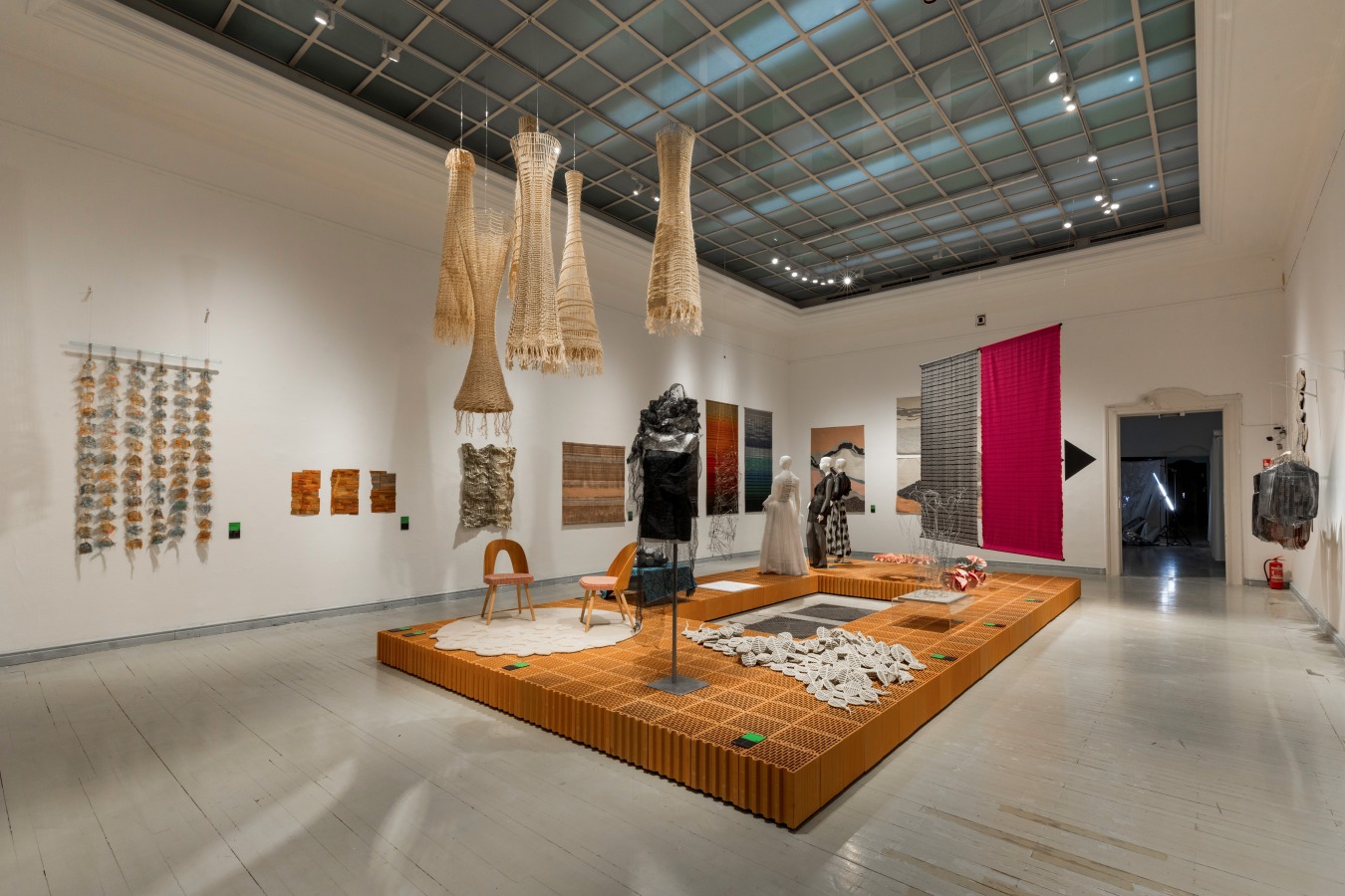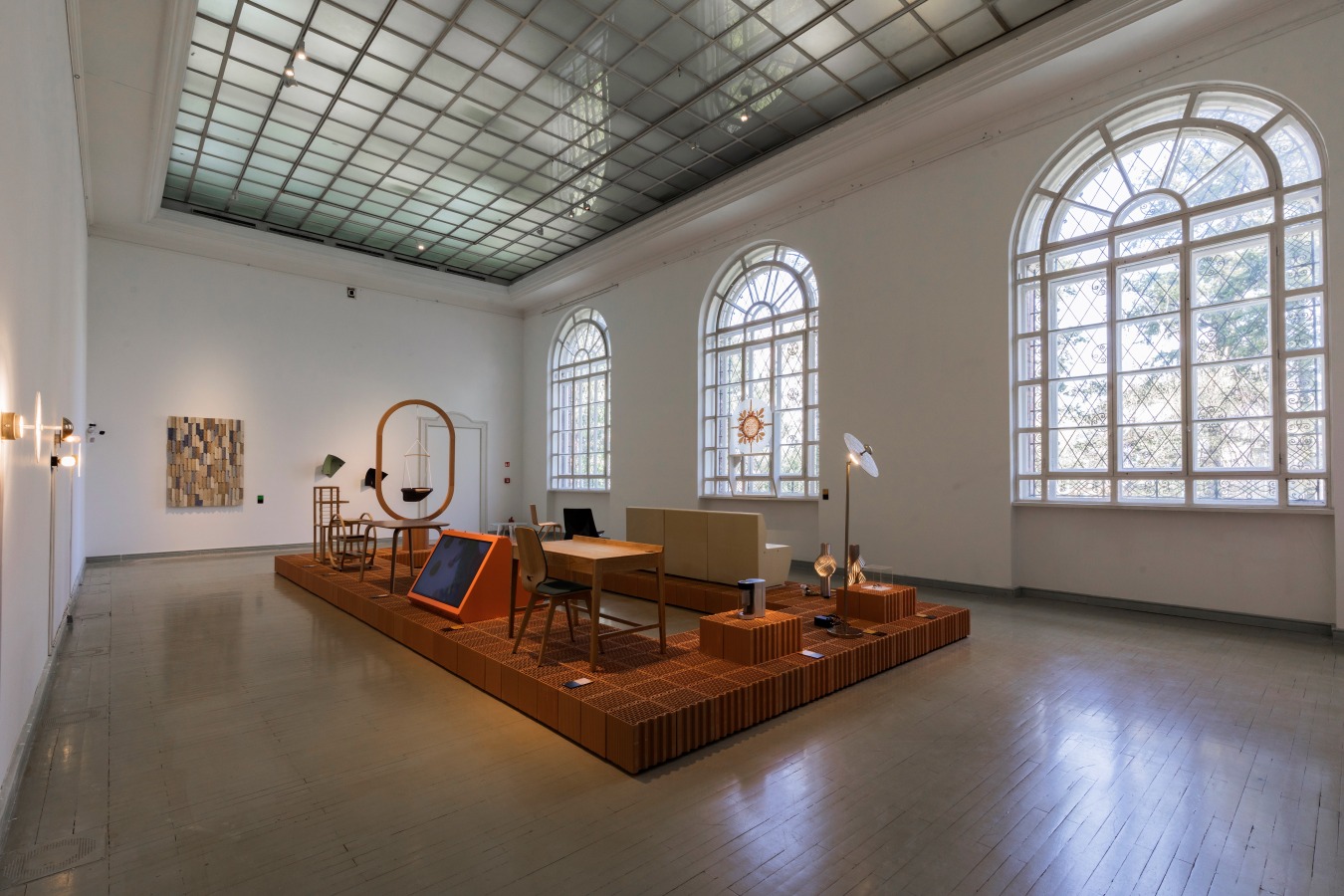 Szabó Levente: A használt anyagokkal a kiállítás tematikájának kézművességre utaló jellegét is ki szerettük volna fejezni, ezért döntöttünk az égetett kerámia posztamensek és a térbe belógatott függönyök egymást ellenpontozó, jótékony kontrasztja mellett. A szalonon kiállított műtárgyak sokszínűsége miatt alapvetés volt egy neutrális posztamensrendszer megtervezése, mely egyszerre képes összefogóan kezelni az összes különböző műtárgyat. Így választottuk ki a nagyméretű üreges vázkerámia falazóblokkot, amelyből vágás, faragás nélkül készült el az összes posztamens. Természetesen az égetett anyag nyers, őszinte látványa is fontos eleme az installáció hangulatának. A falazóblokkok felülete szolgált a műtárgyak hátteréül, környezetéül, így kiemelten fontos volt, hogy kifinomult üregstruktúrájú, csiszolt falazóblokkokból épüljenek a posztamensek.